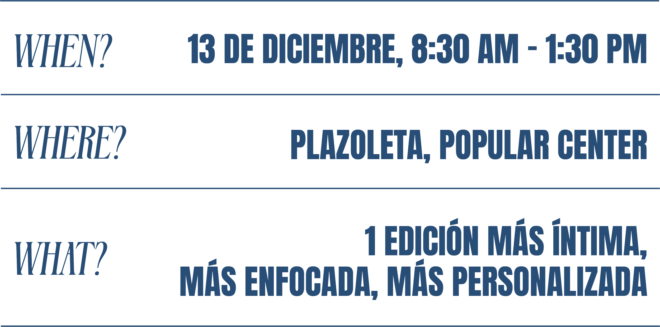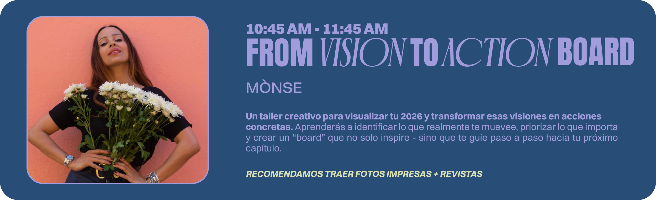 Un evento que te lleva por las fases de cierre de año al estilo MM&I. Empezamos con una introspección profunda hacia tu 2025 junto a la Dra. Veroshk Williams de Reset; pasamos a una meditación anclada en gratitud por el año vivido con Justine Rodríguez de Tribu del Alba; seguimos con fortaleza muscular y sudor con Ale Otero de Muévete Conmigo; continuamos con visión y acción para el 2026 con Mònse de GirlBoss PR x Just B Cuz; y cerramos bailando y celebrando con Griselle Agosto de Kizomba PR porque… ¡TE LO MERECES!